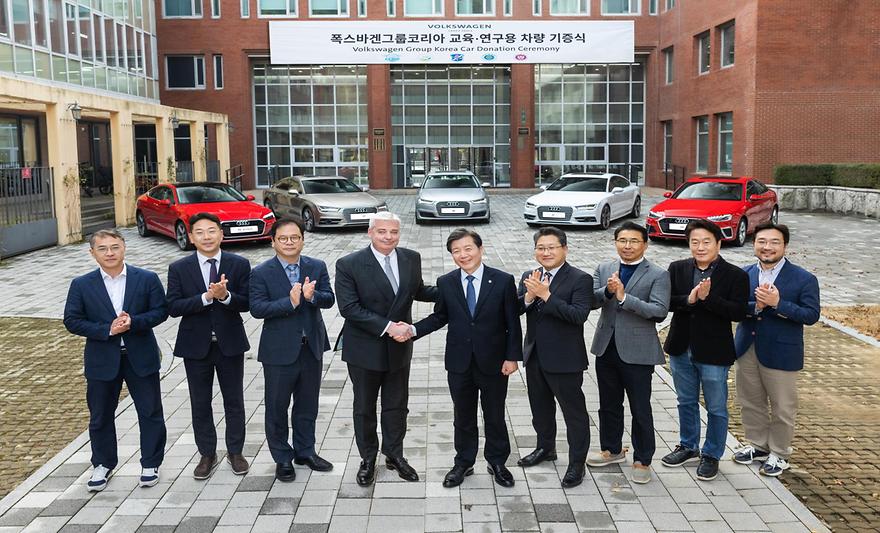 Volkswagen Group Korea donated an Audi vehicle to Ajou University, which will be used for educational and research purposes by the departments participating in the Convergence and Open Sharing System.The donation ceremony took place at Kookmin University on November 29, 2022 with Volkswagen Group Korea President, Till Scheer, President Yim Hong Jae of Kookmin University, and other officials in attendance. Representing Ajou University at the ceremony was Song Bongsob, Dean of the Department of AI Mobility Engineering, which is participating in the Convergence and Open Sharing System, a national project aimed at bringing universities together to develop advanced technology professionals. The Department of AI Mobility Engineering is participating in the Convergence and Open Sharing System in the category of Future Mobility.The donation was an outcome of a drive for industrial-academic cooperation between Volkswagen Group Korea and a Convergence and Open Sharing System consortium. Donated vehicles will be used by four universities participating in the Convergence and Open Sharing System: Ajou University, Kookmin University, Keimyung University, and Chungbuk National University.The vehicle Ajou University will be using is an Audi A6 50 TDI Quattro (above image center) which will be utilized as a learning asset by the Department of AI Mobility Engineering, newly established this year at Ajou University, with next year scheduled as its first year of operation. The vehicle will be put to good use for research and practical learning.Ajou University was selected by the Ministry of Education to participate in the Convergence and Open Sharing System in the category of Future Mobility. The System promotes shared access to advanced technology learning resources dispersed across different universities, and cooperation between businesses, research entities, academic societies, and civilian organizations towards development of core human resources on a national level. Forty-six universities were selected to participate in the eight areas of AI, Big Data, Next-Generation Semiconductors, Future Mobility, Bio Health, Immersive Media, Intelligent Robots, and Energy Industry.A consortium of six universities—Ajou University, Kookmin University, Keimyung University, Sun Moon University, Inha University, Chungbuk National University, and Daelim University—will work in the Future Mobility category. The consortium's participation in the Convergence and Open Sharing System is headed by Kookmin University. From Ajou University, the Department of Transportation Systems Engineering, Department of AI Mobility Engineering, and Department of Mechanical Engineering are participating, together led by Yun Ilsoo, a professor in the Department of Transportation Systems Engineering.<Ajou University students driving test vehicles equipped with advanced sensors. Ajou University uses a number of real vehicles for practical learning and research.># Ajou University YouTube Channel - Introduction of the New Department of AI Mobility Engineering# Official Ajou University Blog - Blog Post: Introduction of the New Department of AI Mobility Engineering and Reading Recommendations