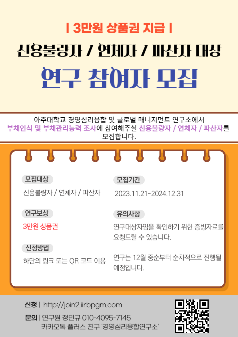 3만원 상품권 지급) 신용불량자 연체자 파산자 대상 연구 참여자 모집
