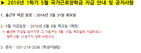 2016학년도 5월 국가근로장학금 일정 안내