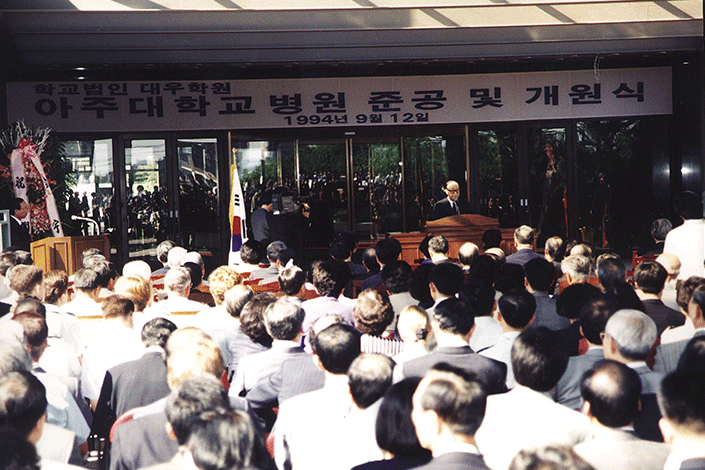 1994년에 아주대학교는 아주대학교병원을 개원했습니다. 1996년에는 교육대학원과 국제대학원 등 특수대학원을 개원하고, 1997년에 정보통신대학을 신설하여 7개 대학, 1개 대학원, 1개 전문 대학원과 8개 특수대학원의 체제를 갖추게 되었습니다. 팔달관, 다산관, 기숙사 2개동, 캠퍼스플라자, 체육관 겸 강당도 신축했습니다.