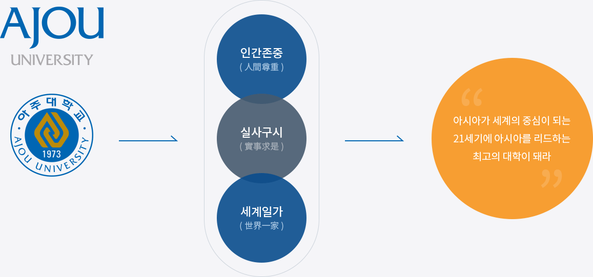 아주대학교는 개교 이래 인간존중, 실사구시, 세계일가를 대학이념으로 추구해 왔습니다.