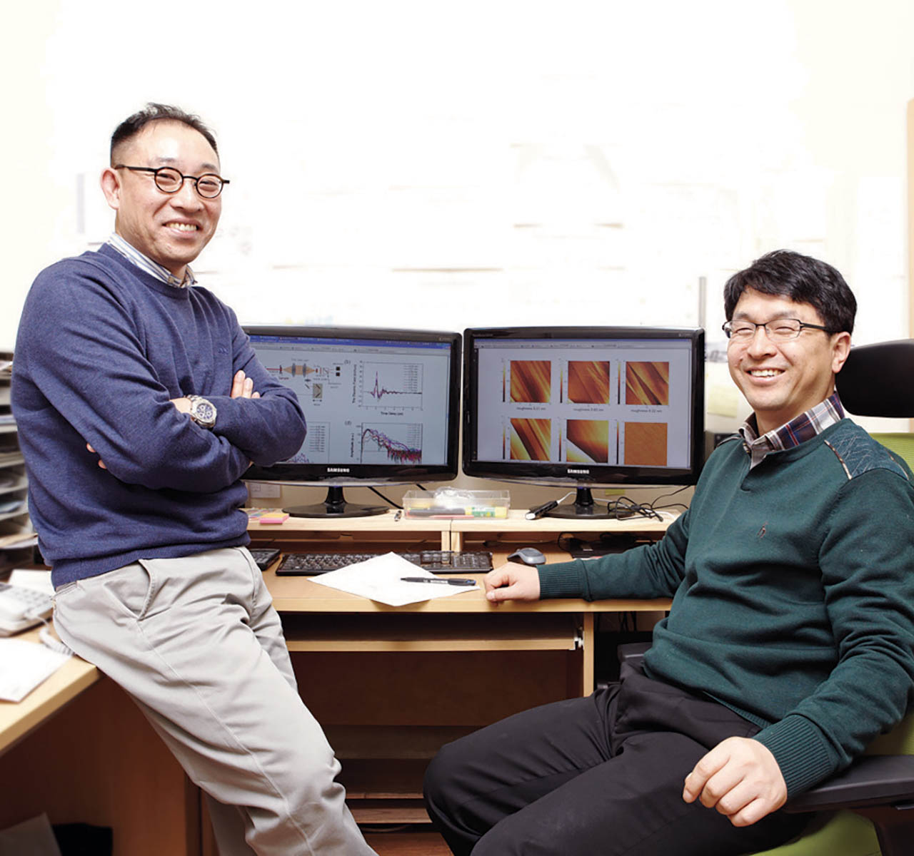 우리 대학 연구진이 초박막형 두께로 전자기파의 주파수를 고효율로 변환시킬 수 있는 소재를 개발했다. 사람 머리카락 굵기의 10분의 1 수준에 해당하는 두께로, 이 소재 설계 기술을 이용하면 레이저와 통신 등을 위한 다양한 광학 변환 소재의 개발이 가능해질 전망이다. 권오필 아주대 교수(응용화학생명공학과·대학원 분자과학기술학과, 사진 왼쪽)와 이상민 한국과학기술원(KAIST) 교수(물리학과, 사진 오른쪽) 연구팀은 기존 광학결정의 비선형성을 월등히 뛰어넘는 새로운 양이온과 이에 적합한 음이온을 도입하는 새로운 결정 기술을 적용하여, 기존에 없던 극한의 비선형광학 특성을 가지는 유기결정을 개발했다고 밝혔다. 이번 연구 성과는 소재 분야 저명 학술지인 <어드밴스드 펑셔널 매터리얼즈(Advanced Functional Materials)> 온라인판에 게재되었다. 논문 제목은 "극한 초분극도를 가지는 새로운 종류의 유기 결정: 고효율 및 광대역 평면 스펙트럼 대역을 가지는 테라헤르츠 발생(A New Class of Organic Crystals with Extremely Large Hyperpolarizability: Efficient THz Wave Generation with Wide Flat-Spectral-Band)"이다.비선형 광학(nonlinear optics)은 빛과 물질 간에 일어나는 비선형적 특성을 연구하는 학문으로, 주파수(파장)로 대표되는 빛의 특성을 바꾸는 광변조 기술과 고감도 분석 등에 활용된다. 이러한 광학 연구에 쓰이는 비선형 광학 결정(nonlinear optical crystal)은 물질 내에서 주파수를 비롯한 다양한 빛의 특성을 조절할 수 있는 소재다. 전자기파의 주파수를 높은 주파수로 변환하거나, 반대로 낮은 주파수로도 바꿀 수 있어서다. 빛의 핵심 특성인 주파수를 변환할 수 있다면, 빛의 특성 조절을 통해 다양한 방식으로 빛을 광범위하게 활용할 수 있게 된다. 예를 들어 눈으로 볼 수 없는 적외선의 빛을 높은 주파수의 가시광선으로 바꿀 수 있어 눈으로 확인할 수 있게 되고, 이와는 반대로 적외선의 빛을 이용해 낮은 주파수인 테라헤르츠파(terahertz wave, THz)를 만들어 낼 수도 있다. 또한 빛의 특성을 조절해 빛을 이용하는 다양한 분석 장비에서 그동안 측정하지 못하던 소재를 분석할 수 있게 되거나, 이전에 비해 더 넓은 부분을 볼 수도 있게 된다.그러나 기존에 활용되던 유기 소재 및 무기 소재의 광학 결정은 낮은 테라헤르츠파 주파수 변환 효율을 나타낸다는 점이 한계로 지적되어 왔다. 이를 개선하기 위해 밀리미터 이상 두께의 광학 결정을 사용하는 방법이 제시되었으나, 이러한 방법 역시 여러 측면에서 한계를 보여왔다. 예를 들어 좁은 대역의 테라헤르츠파만을 발생시키거나, 주파수 대역에 많은 공백이 나타나는 등의 문제다. 그동안 테라헤르츠 광원 소재를 연구해 온 권오필 교수 연구팀은 새로운 설계를 통해 전자기파의 주파수를 고효율로 변환시킬 수 있는 이온성 유기광학 소재를 개발하는 데 성공했다. 테라헤르츠파(terahertz wave, THz)는 빛과 전파 두 가지 특성을 동시에 띄는 독특한 전자기파다. 인체에 무해하고 인간의 눈에 보이지 않는 부분까지 선택적으로 관찰할 수 있다. 의료와 보안, 환경, 산업계 등 다양한 분야에서 응용이 가능하다.이온성 유기광학 소재는 양이온 분자와 음이온 분자로 이루어져 있다. 기존에 개발되어 주로 사용되어 오던 이온성 광학 소재의 경우, 사용된 음이온의 종류가 매우 한정적이었으며 유사한 크기를 가지고 있었다. 주파수 변환 효율은 비선형성이 높을수록 향상되는데, 소재의 비선형성 향상을 위해 양이온 분자를 새로 설계해야 하는 상황에서는, 기존의 음이온 도입으로 문제를 해결하기 어렵다는 한계가 존재했다. 이에 공동 연구팀은 지금까지 보고된 비선형성을 뛰어넘는 극한의 비선형성을 가지는 새로운 양이온 분자를 설계하면서, 동시에 이에 적합한 음이온을 도입했다. 연구팀은 이를 기반으로 마이크로미터 두께의 초박막형 주파수 변환 소재를 개발해냈다. 이번 연구에서 개발한 10 마이크로미터 두께의 새로운 초박막형 광학결정은 기존에 상업화되어 있는 무기 결정에 비해 100분의1 수준 두께다. 초박막형 두께로도 기존 무기 결정 보다 약 5배 높은 주파수 변환 효율을 보였으며, 더 넓은 대역의 더 평평한 스펙트럼 형태를 가지는 테라헤르츠파를 발생시킴을 확인했다. 고효율 광대역 테라헤르츠파의 발생은 더 넓은 주파수 대역에서 더욱 고감도로 분석이 가능함을 의미한다. 이에 기존의 다른 레이저로는 탐지할 수 없었던 위험·유해한 물질의 고감도 식별이나 보안 측면에서 장점을 가지는 테라헤르츠 탐지·분석 기술 등에 응용될 전망이다. 권오필 교수는 "이번에 개발한 새로운 비선형 광학 결정 소재는 테라헤르츠뿐 아니라 다양한 전자기파 변조·변환 소자에도 적용 가능할 것으로 기대한다"며 "이와 같은 고효율 비선형 광학 소재는 전자기파의 주파수, 위상, 크기 등을 바꿀 수 있는 다양한 레이저와 통신 소자에 활용할 수 있다"고 말했다.(그림 위) 아주대·카이스트 공동 연구팀이 새로 개발한 초박막형 변환소재는 기존 무기소재보다 강하고, 넓은 영역의 평평한 테라헤르츠 스펙트럼을 발생시킴. 이는 이상적인 테라헤르츠 분광기 광원(하단 좌측)의 